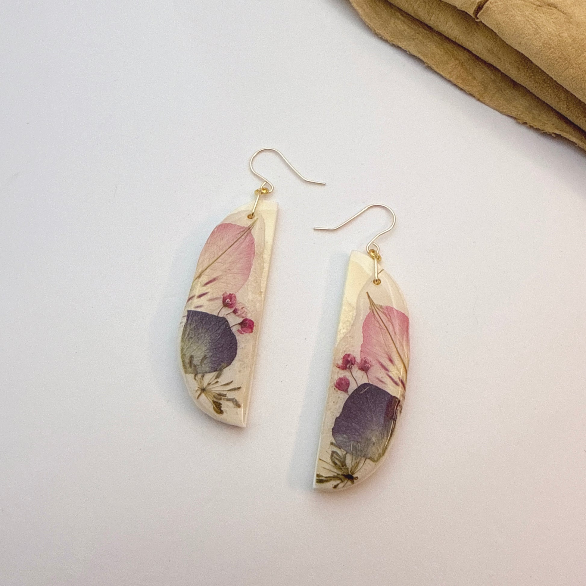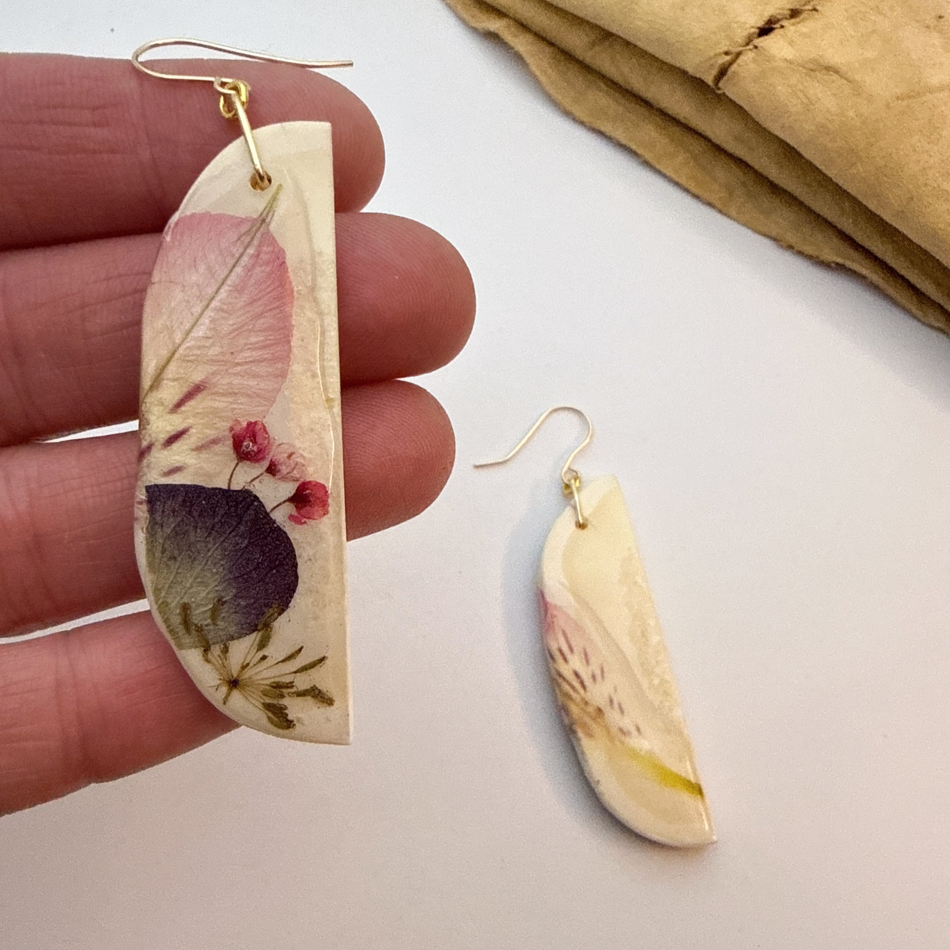 walrus ivory and resin earrings with pressed flowers that wrap around the earring