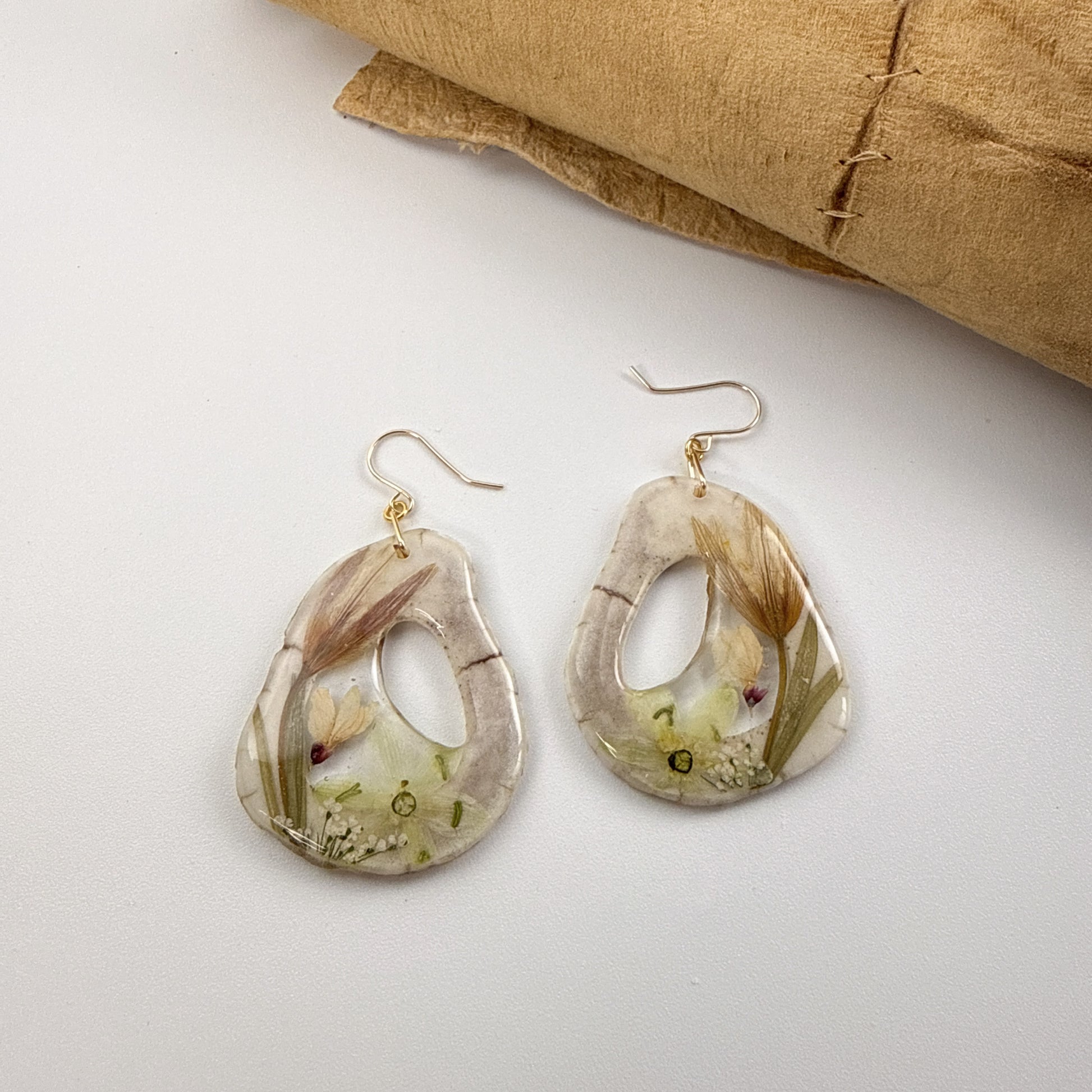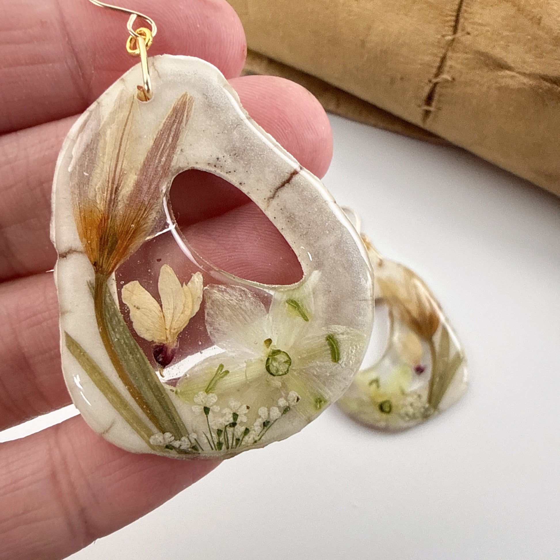 antler and resin earrings with pressed flowers